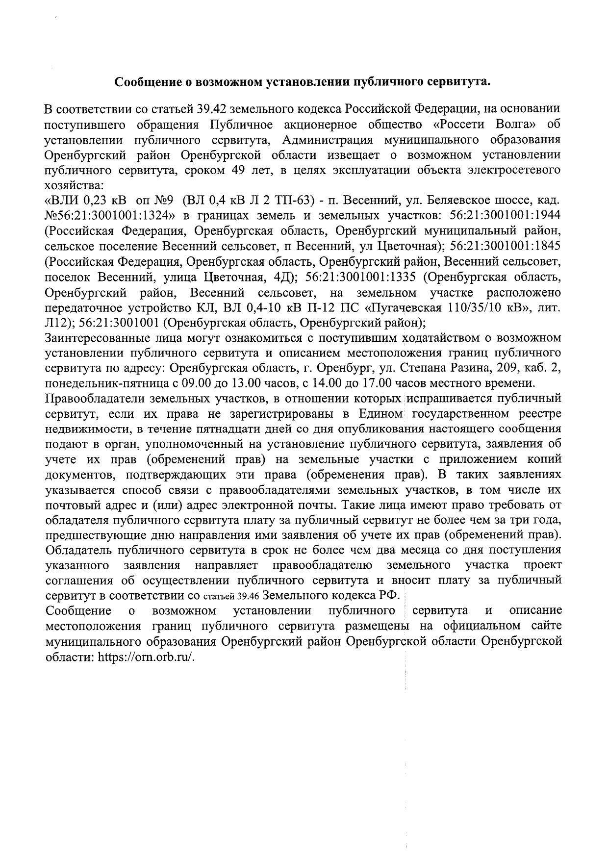 Сообщение о возможности установления публичного сервитута ВЛИ 0,23кВ оп№9